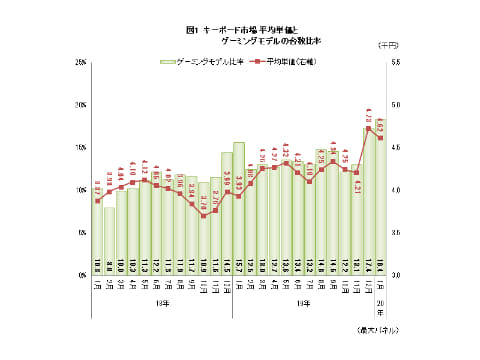 キーボード市場の平均単価とゲーミングモデルの台数比率 出典:BCN