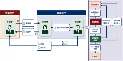 次に、こうした可視化された業務プロセスを業務プロセスマネジメント(BPM)ツールで最適化し、担当者を定義。最適化された業務プロセスについて、BPMツール上で進行状況や作業の滞留、負荷状況の見える化を実施する。これは、部門をまたがる業務プロセスにも適用可能という。
